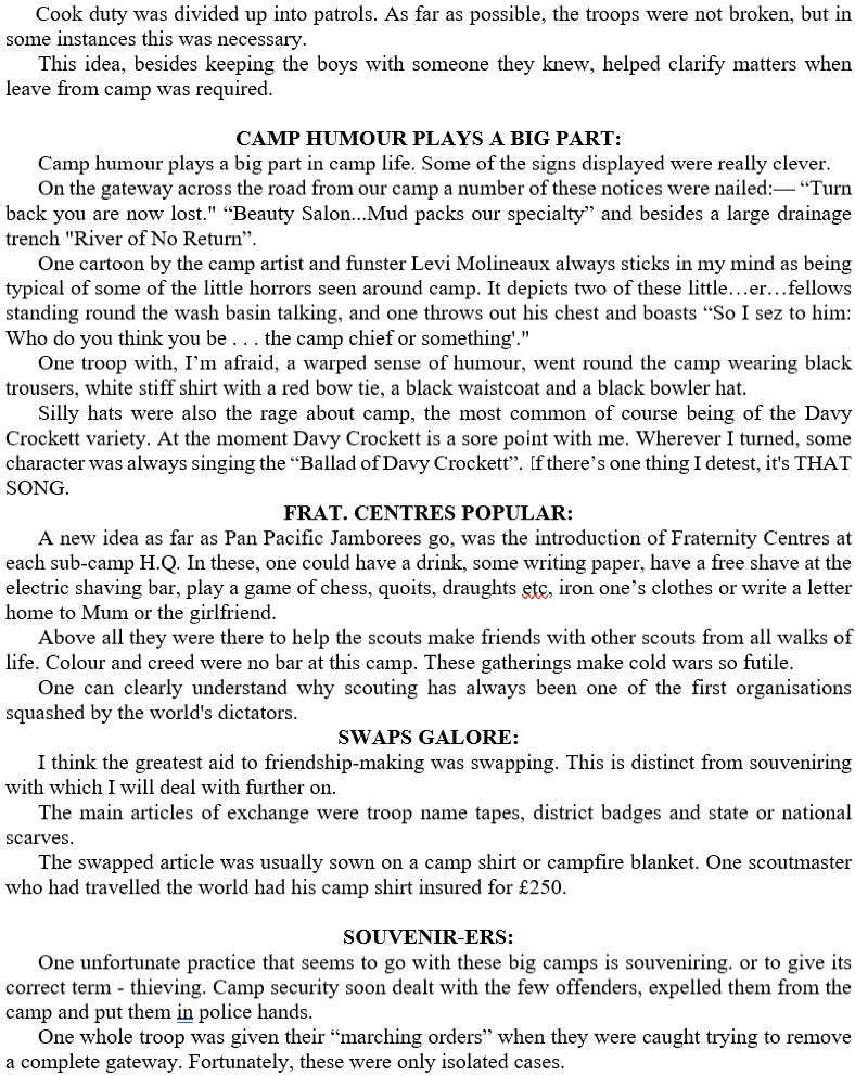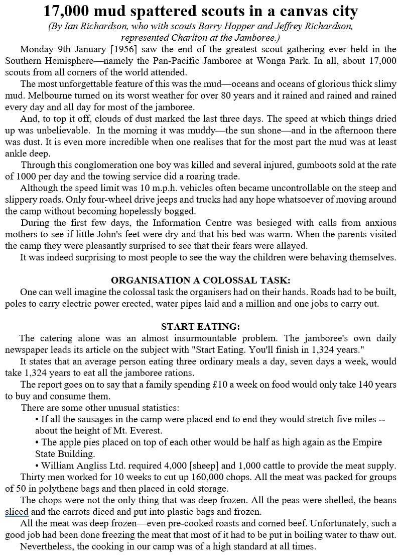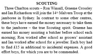 That said, I repeat that I continue to enjoy writing at whatever level of skill and will admit that it is a compulsion. Nothing that I wrote in my very early days seems to have survived. However, when I began my printing apprenticeship with the family newspaper, the Charlton Tribune, I did contribute occasional small news items. My first by-lined article was published in the Tribune in 1956 when I was 18 and had returned from a scout jamboree at Wonga Park on the outskirts of Melbourne:
