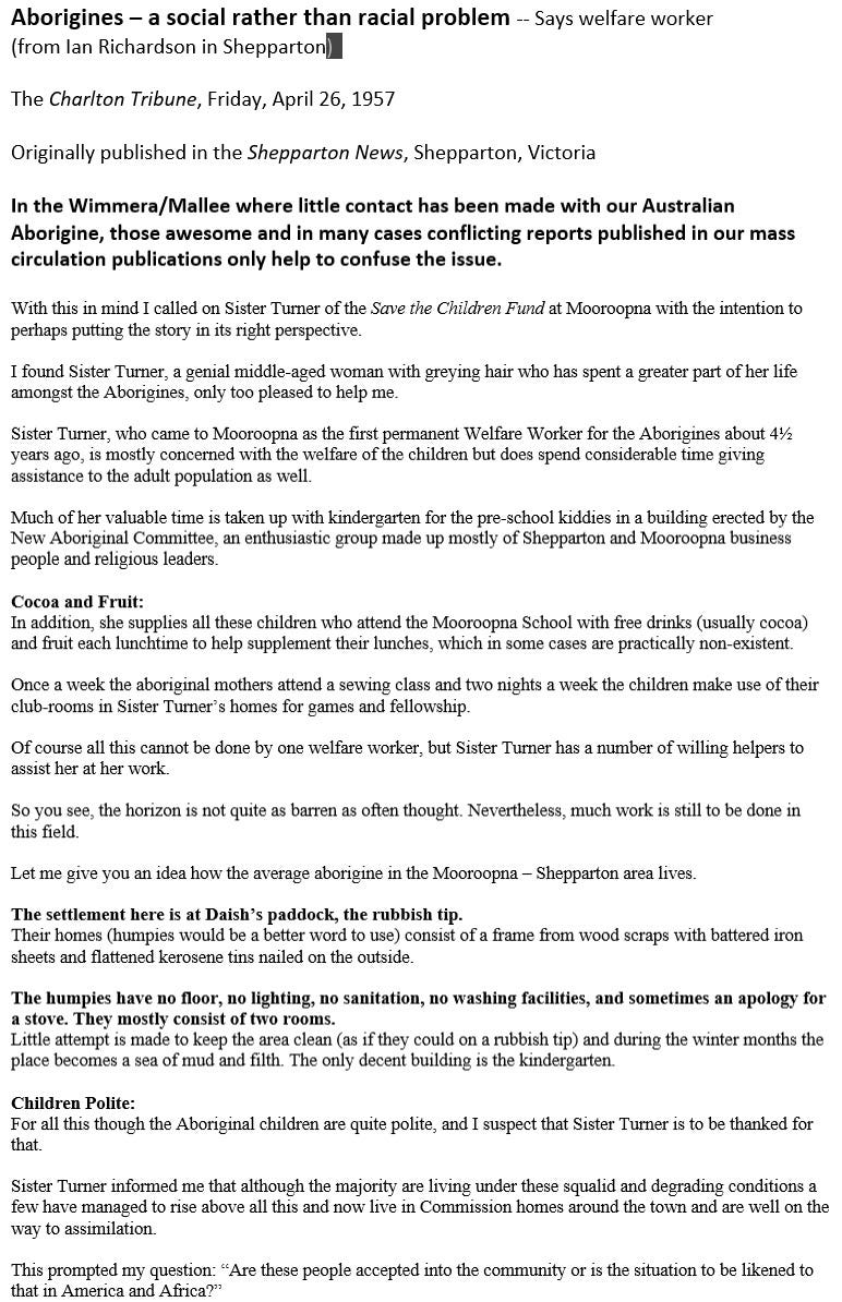 My printing apprenticeship was completed with the Shepparton News in Shepparton Victoria. On taking some rubbish to the tip at the neighbouring town of Mooroopna, I was shocked to see that the occupants were a large family of Aborigines. This prompted me to write the following article that was published in the Shepp News, as it was widely known. I was then aged 19: