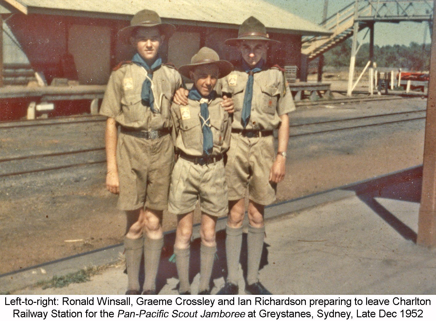 That was my second scout jamboree. The first was in Sydney in 1952 with my lifetime mate, Ron Winsall, and the late Graeme Crossley, tragically killed in a car crash in his twenties. Here we are about to set out from Charlton on a very long and tedious steam train journey to Sydney: